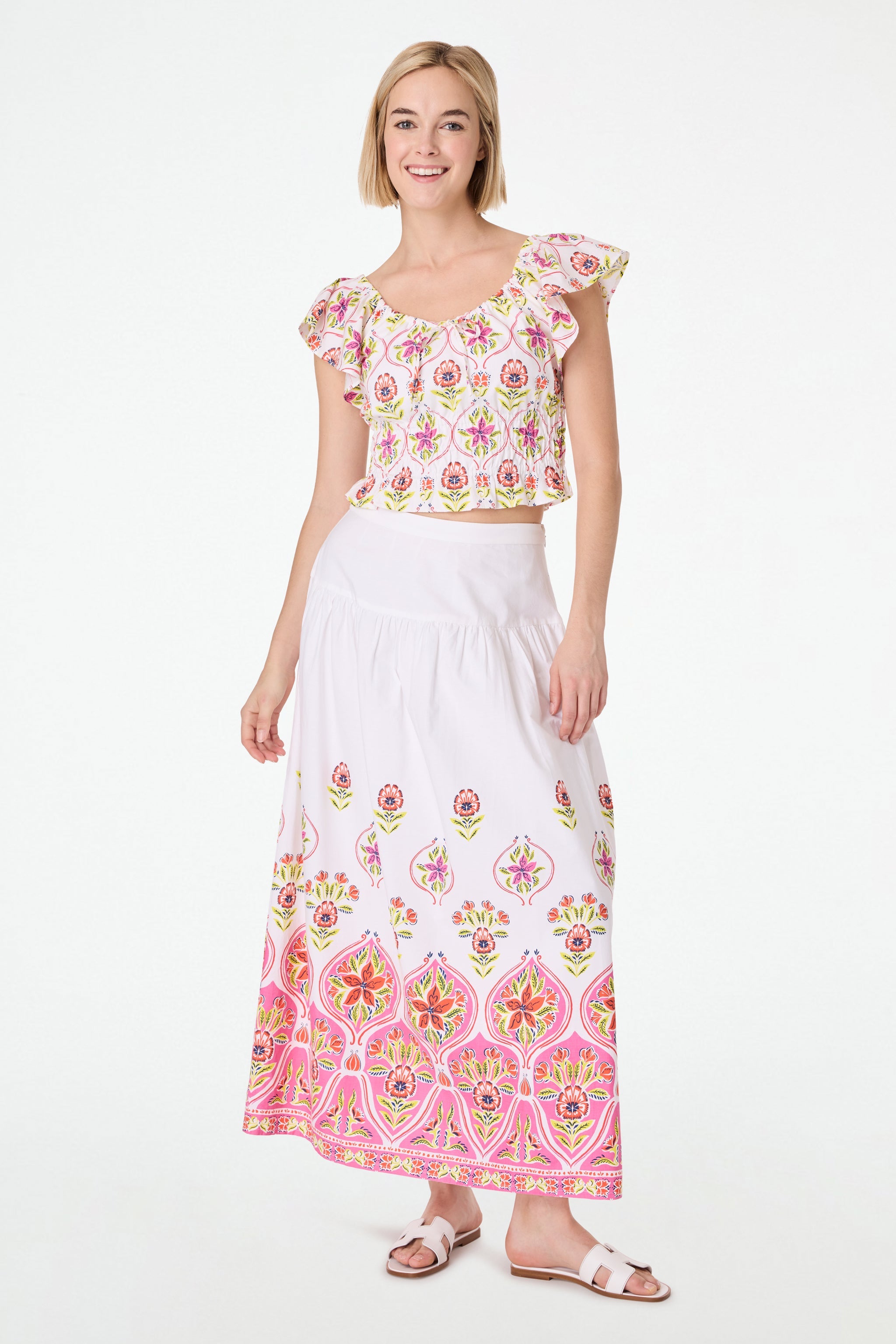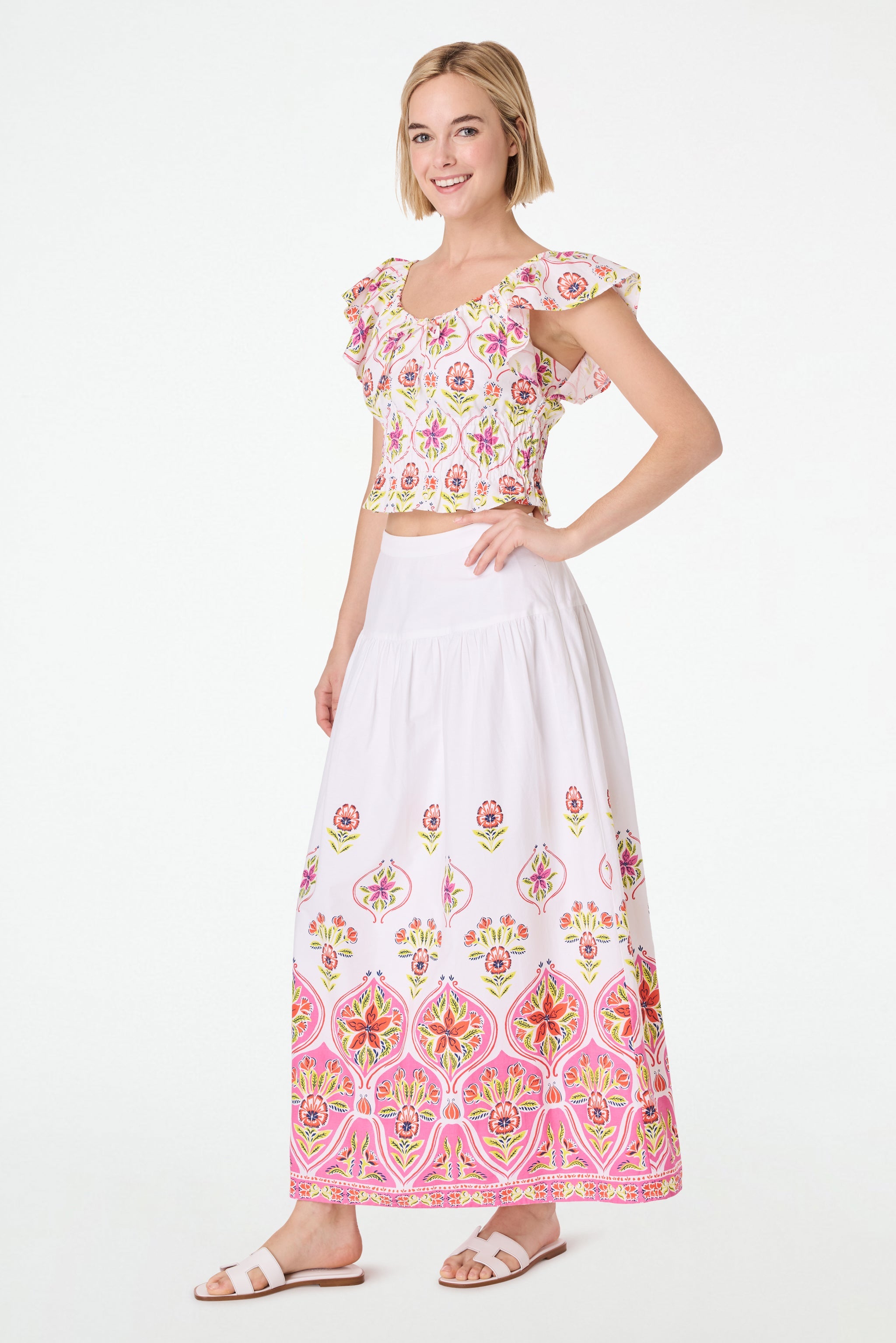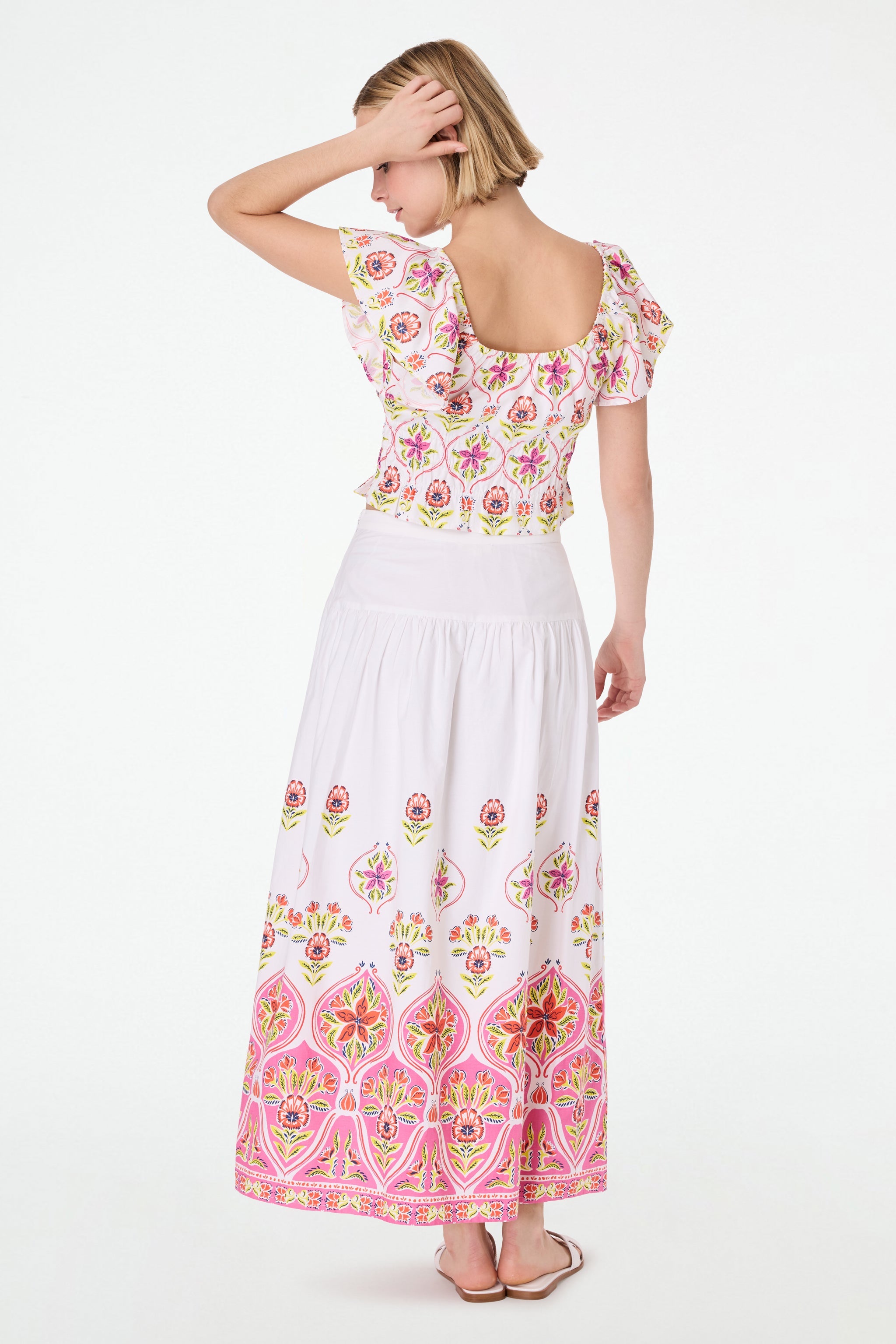A full, feminine cotton skirt makes everything feel more romantic. Carlene is a maxi-length skirt in crisp cotton poplin embellished with our gorgeous Fontana Floral print.